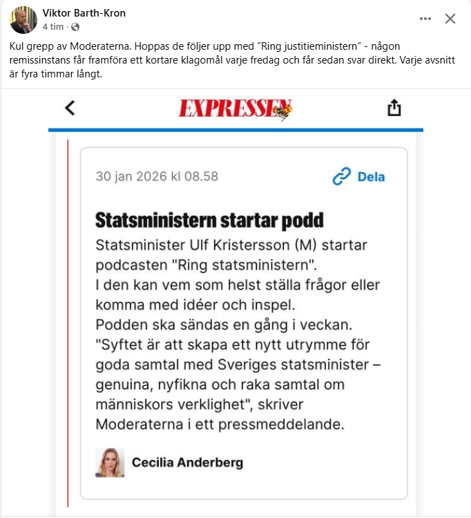 Det här tyckte jag var hutlöst roligt, både greppet och Strömmers svar. Över huvud taget känns det som att någon med känsla för kommunikation har fått kontroll över regeringskansliet. Det kommer utspel som är mänskliga och som känns angelägna, inte bara politiskt kryptiska.